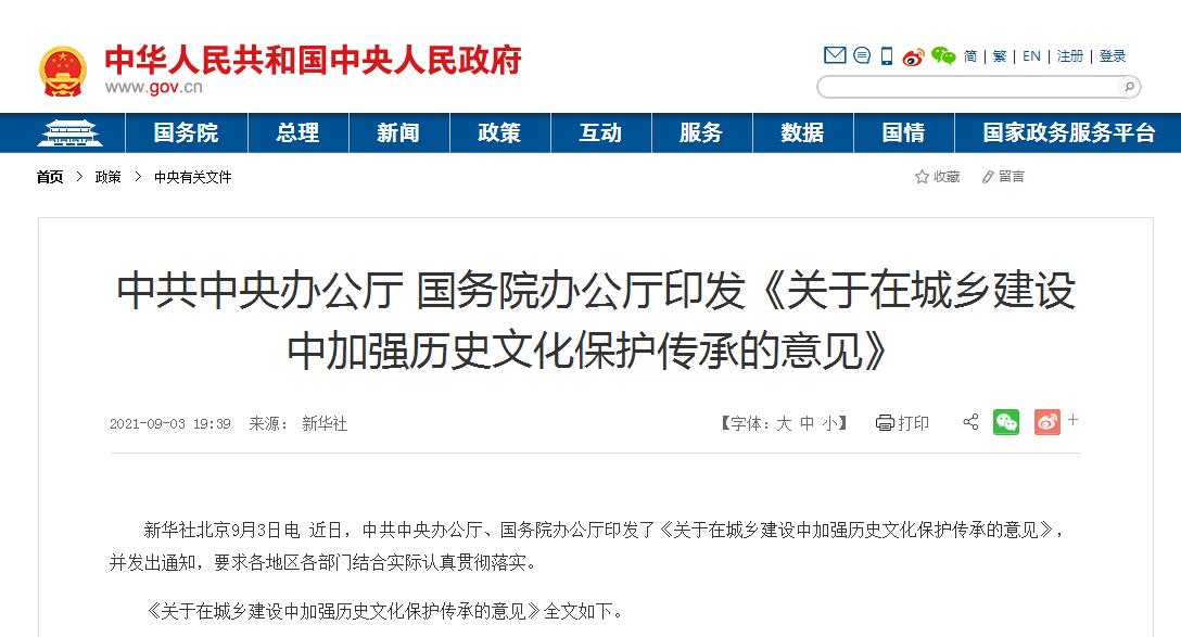 2021年9月3日,中共中央辦公廳、國務院辦公廳印發了《關于在城鄉建設中加強歷史文化保護傳承的意見》。《意見》是我國在1982年建立歷史文化名城保護制度近40年以來,首次以中央名義專門印發的關于城鄉歷史文化保護傳承的文件。《意見》提出了在城鄉建設中系統保護、利用、傳承好歷史文化遺產的重要意義,在總體要求中提出四個工作原則,提出構建城鄉歷史文化保護傳承體系,以及工作機制、保障措施。