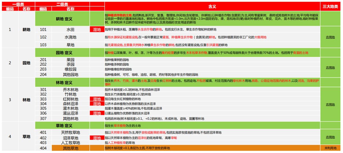 概要:《土地利用現(xiàn)狀分類》(GB/T 21010-2017):一級分類12類,二級分類73類;二級分類中:農(nóng)用地 ● 23類,建設(shè)用地 ● 39類, 未用地 ● 11類;濕地 ● 14類